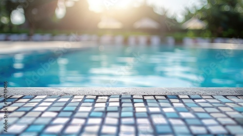 White ceramic mosaic table with blurred swimming pool backdrop for product display in summer resort.