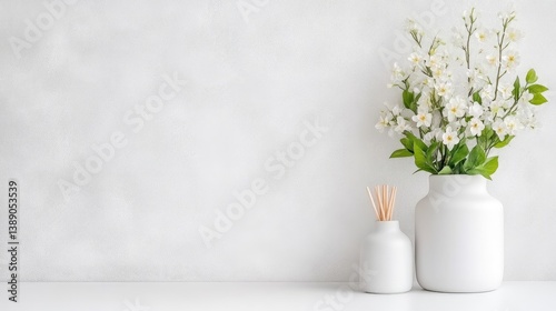 White ceramic vases with delicate flowers on a minimalist shelf, soft focus background, and serene and elegant home decor arrangement.