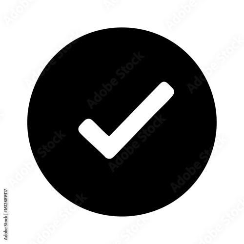 White check mark in black circle for presentations,reports, websites. Verification symbols for success,facts, completion, selection, acceptance, authenticating.