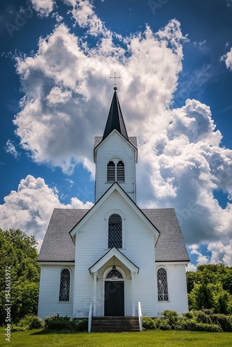 White Church with Black Roof and Bell Tower Against Blue Sky with White Clouds, Front View