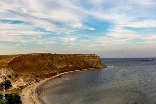 White Cirrus clouds in the blue sky on the Alexander graben. Steep cliff on the bank of the Volga River (Volgograd, Russia). Red clay, yellow sand on the beach, steep walls of the ravine.
