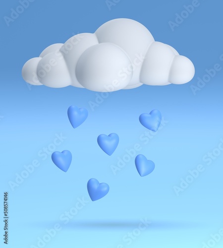 White cloud with rain of blue hearts on blue background. 3D rendering