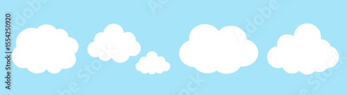 White clouds set in cute cartoon flat style on pastel blue background vector illustration. Clouds elements for newborn, nursery, stickers, decoration.