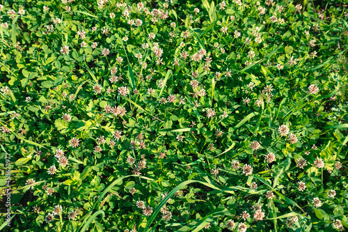 White clover on summer meadow. Blooming clover flowers in green grass. Summer grassal background. Picture for post, screensaver, wallpaper, postcard