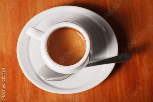 White coffee Cup with delicious foam, close-up top view on wooden background. Concept of coffee break and serving coffee