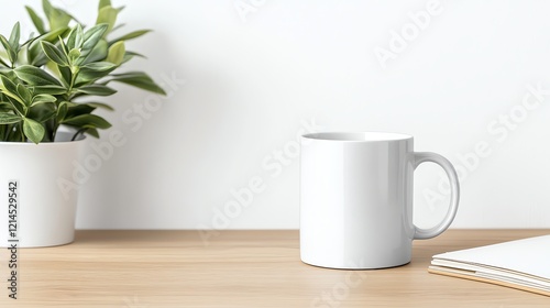 White coffee mug and potted plant on wooden desk with notebook against a minimalist white background, creating a serene workspace aesthetic.