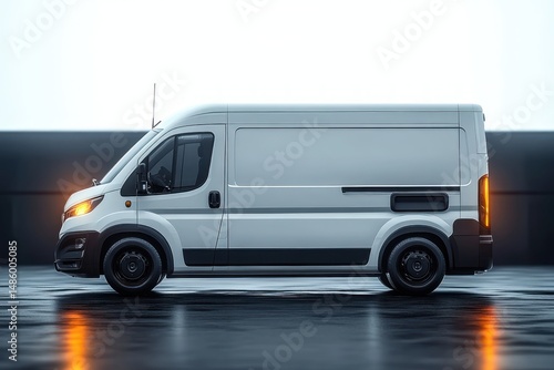 White commercial cargo van parked on wet asphalt with headlights and rear lights on against a minimalist dark background conveying readiness and utility
