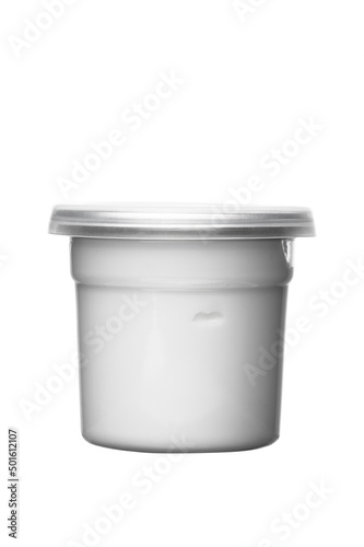 white cream or face mask in transparent package with metal tin lid, isolated on white background.