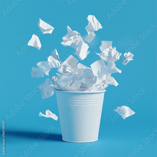 White, crumpled pieces of paper are tossed into a trash can. The blue background provides a blank space for designers.