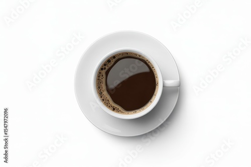white cup and saucer with coffee, isolated beverage design element, top view / flat lay isolated, white background