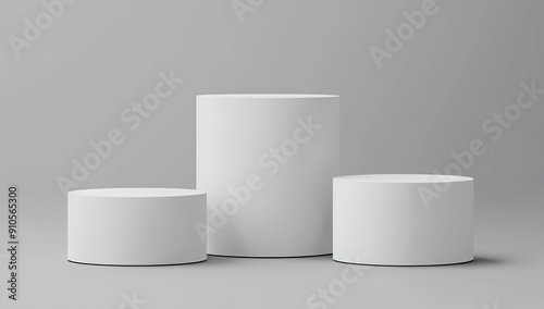 white cylinder podiums, one large and two small on grey background,...