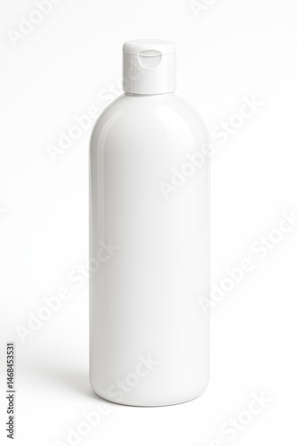 White Cylindrical Plastic Bottle with Flip Top Cap for Dish Soap with Glossy Finish and Photorealistic Detail, Perspective Front View, Professional Studio Lighting on Isolated White Background