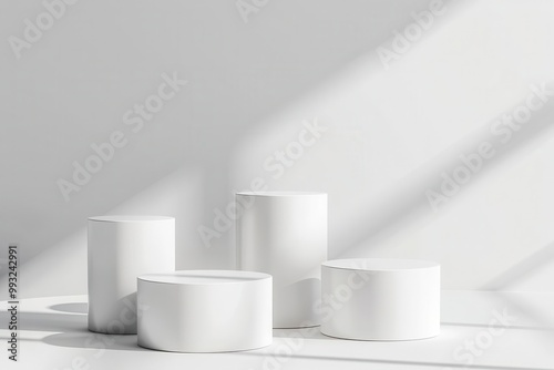 White cylindrical podiums in a minimalist studio, soft shadows, clean surfaces, perfect for product display, high-resolution