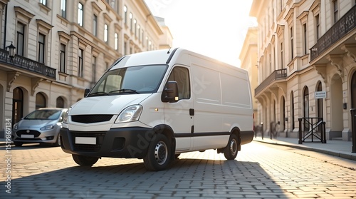White Delivery Van Parked on Cobblestone Street in City Center at Sunset, Urban Logistics, Commercial Vehicle Illustration