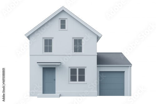 White detached residential building, wooden siding, attached garage, transparent background facilitating architectural design rendering