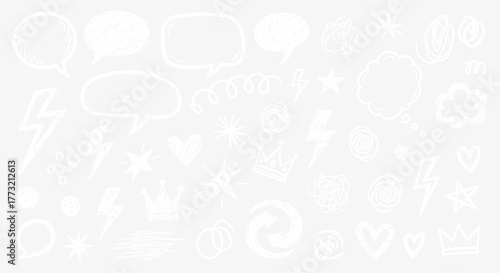 White doodle elements with speech bubbles, lightning, crowns isolated on transparent background