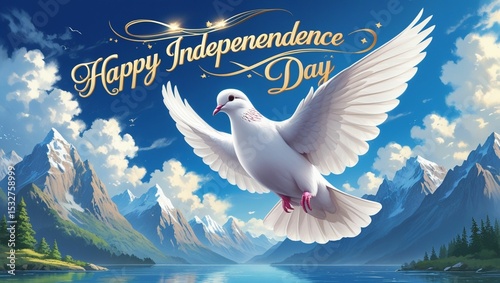 White dove soaring above mountains and lakes with golden “Happy Independence Day” text arched in the sky