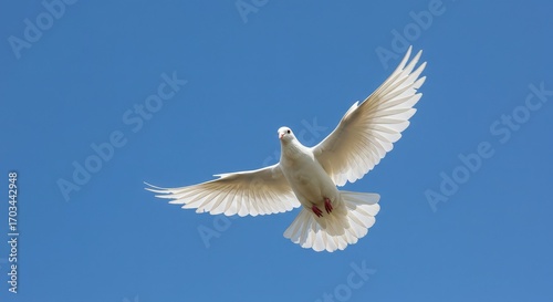 White dove soaring gracefully against vibrant blue sky, symbolizing peace, freedom, and hope, perfect for inspirational campaigns
