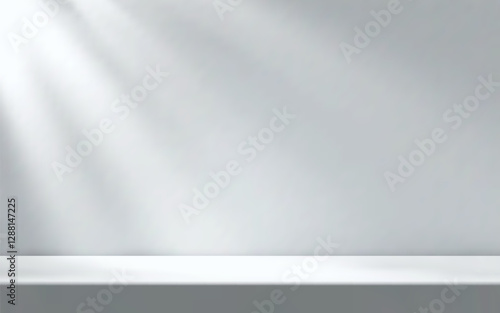 White empty room illuminated by the sun rays with table surface. Product presentation template.