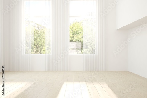 White empty room with summer landscape in window. Scandinavian interior design. 3D illustration