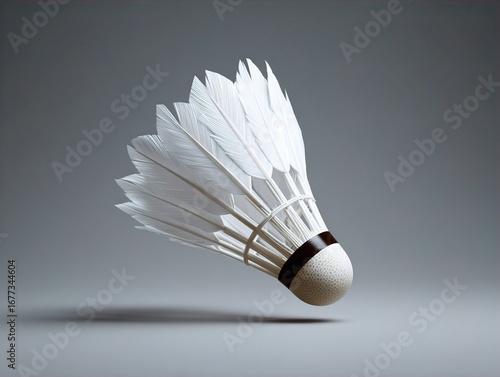 White Feather Badminton Shuttlecock Gracefully Floating in a Minimalist Studio Setting with a Soft Shadow on a Clean Grey Background