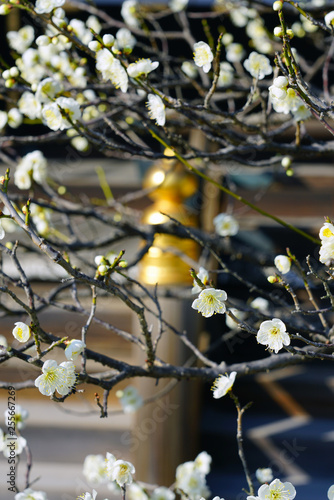White flower blooms of the Japanese ume apricot tree, prunus mume, in winter in Japan