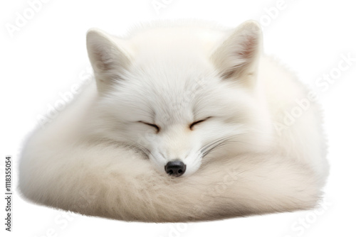 White fox curled up in a relaxed position, displaying its soft and voluminous fur, isolated on white background