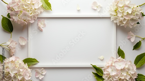 White frame surrounded by delicate pink hydrangea blossoms and green leaves on a white background.