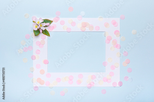 White frame with pastel colored confetti and apple bloom on light blue with place for text, top view, flat lay. Moc up spring time card.