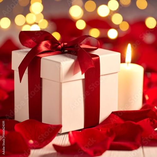 White gift box with red ribbon, candle, and rose petals on a wooden surface with bokeh lights