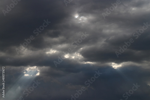 White grey cloudy day after rain with little bit ray of sun shining through the clouds, Sky nature background.