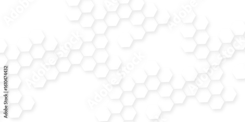 White hexagonal shapes arranged in a honeycomb structure, Abstract white hexagonal shapes on a light grey background.