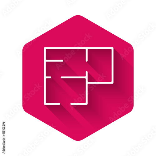 White House plan icon isolated with long shadow background. Pink hexagon button. Vector.