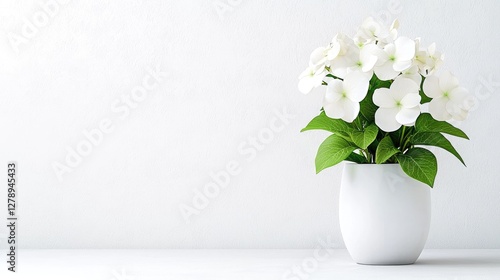 White hydrangeas in pot, minimalist room decor, simple background, website design