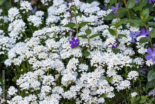 White Iberis evergreen (lat. Iberis sempervirens) and lilac Periwinkle (Vinca) in the shade of the garden