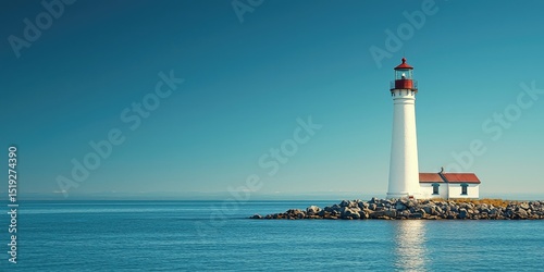 White lighthouse stands on rocky island surrounded by calm blue ocean under clear sky with light clouds. Generative by AI.