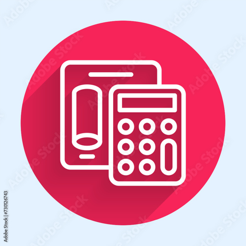 White line Calculator icon isolated with long shadow background. Accounting symbol. Business calculations mathematics education and finance. Red circle button. Vector