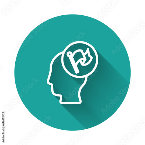 White line Hand holding flag icon isolated with long shadow background. Victory, winning and conquer adversity concept. Green circle button. Vector