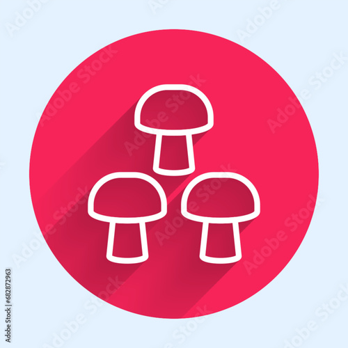 White line Mushroom icon isolated with long shadow. Red circle button. Vector
