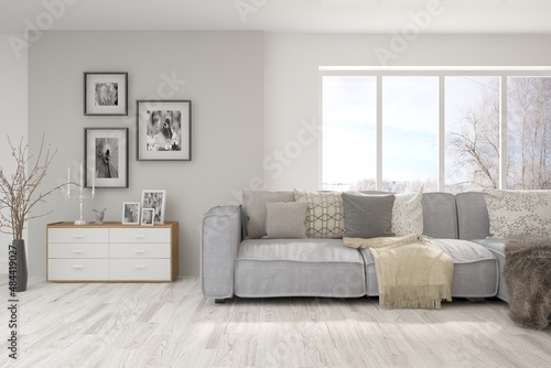 White living room with sofa and winter landscape in window. Scandinavian interior design. 3D illustration