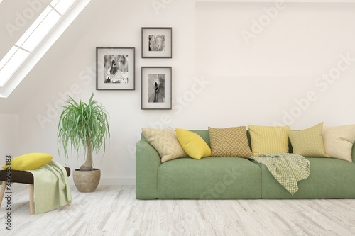 White living room with sofa. Scandinavian interior design. 3D illustration