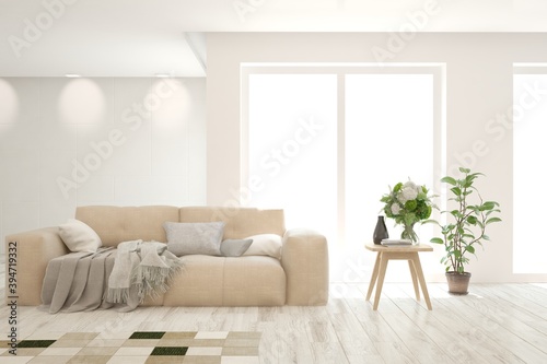 White living room with sofa. Scandinavian interior design. 3D illustration