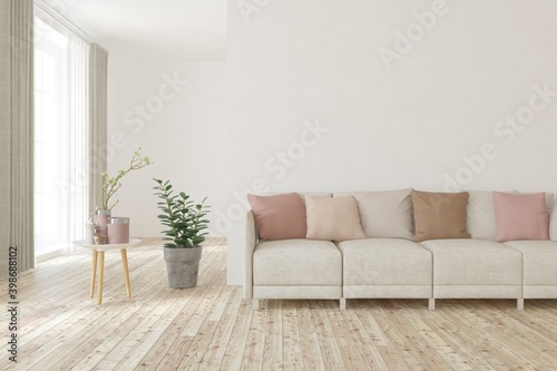 White living room with sofa. Scandinavian interior design. 3D illustration
