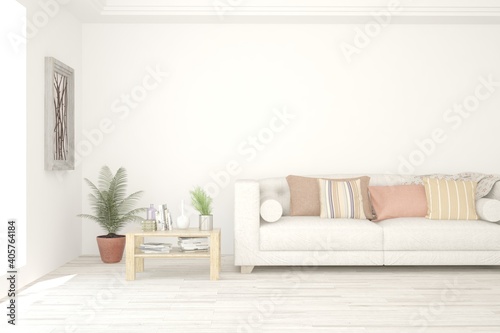 White living room with sofa. Scandinavian interior design. 3D illustration