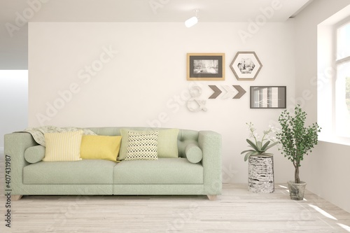 White living room with sofa. Scandinavian interior design. 3D illustration