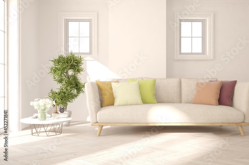 White living room with sofa. Scandinavian interior design. 3D illustration