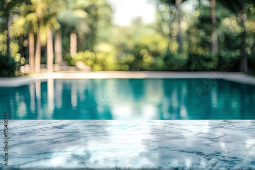 white marble top with blurred empty Swimming pool background can be used for mocking up or display product to make advertising , ai
