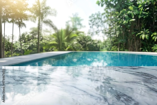 white marble top with blurred empty Swimming pool background can be used for mocking up or display product to make advertising , ai