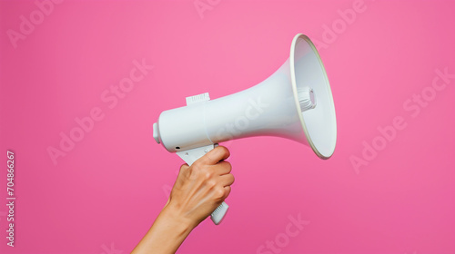 White Megaphone in woman hands isolated on a pink background generated by ai