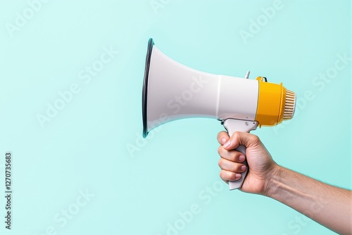 White megaphone with yellow details held by a hand, isolated on a light cyan background. Concept of announcement, communication, or promotion. Ai generative